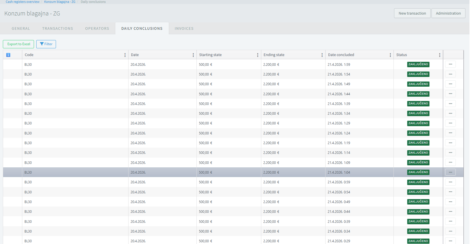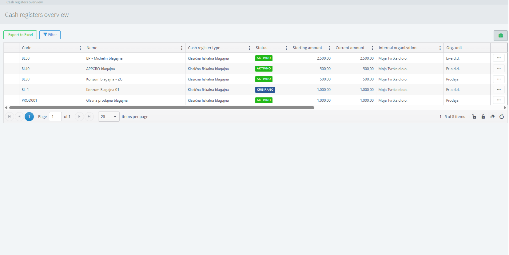 The cash register overview provides a clear and structured display of all cash registers in the system in one place. It shows key information such as code, name, type of cash register, status, opening and current amounts, and organizational affiliation. Users have access to filtering and data export options (e.g., to Excel), as well as quick access to additional actions for each cash register. This overview simplifies monitoring, comparison, and management of multiple cash registers within the organization.