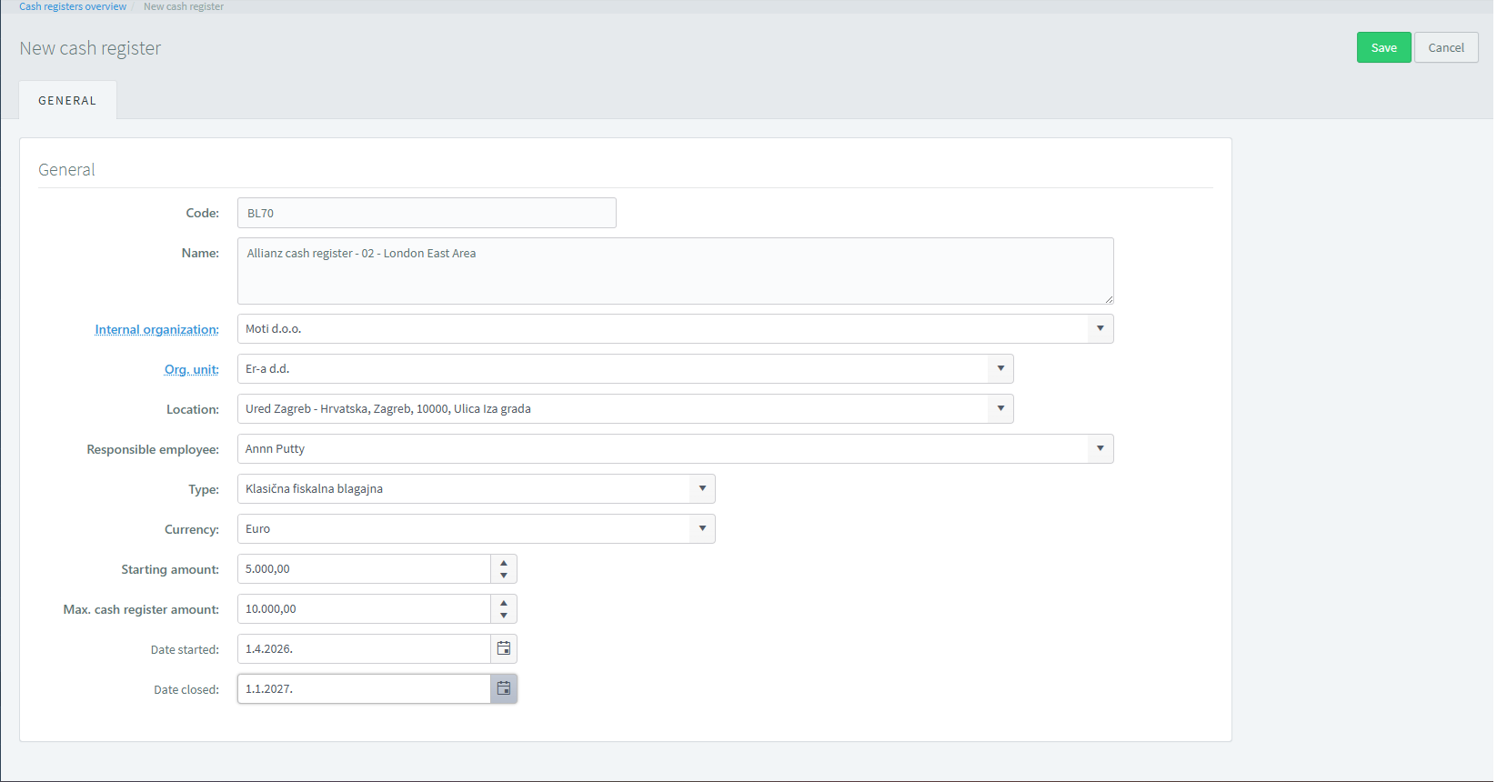 Creating a new cash register allows entry and configuration of all key data required for its operation within the system. The user defines basic information such as code and name, organizational affiliation, location, and the responsible person. Financial parameters are also set, including the type of cash register, currency, opening and maximum amounts, as well as the start date and optional closing date. After entering the data, the cash register is saved and becomes available for further use and management within the system.