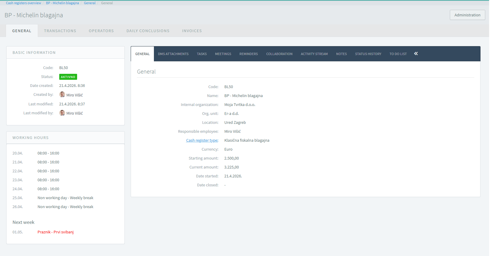 The cash register profile provides an overview of key information and activities related to an individual cash register. It includes basic details (code, name, location, responsible person), status, and financial information such as currency and opening and current balances.Through the profile, users can access important functionalities such as transactions, operators, daily closings, and receipts, enabling efficient monitoring and management of cash register operations. It also includes an overview of working hours and important dates to support easier work organization.