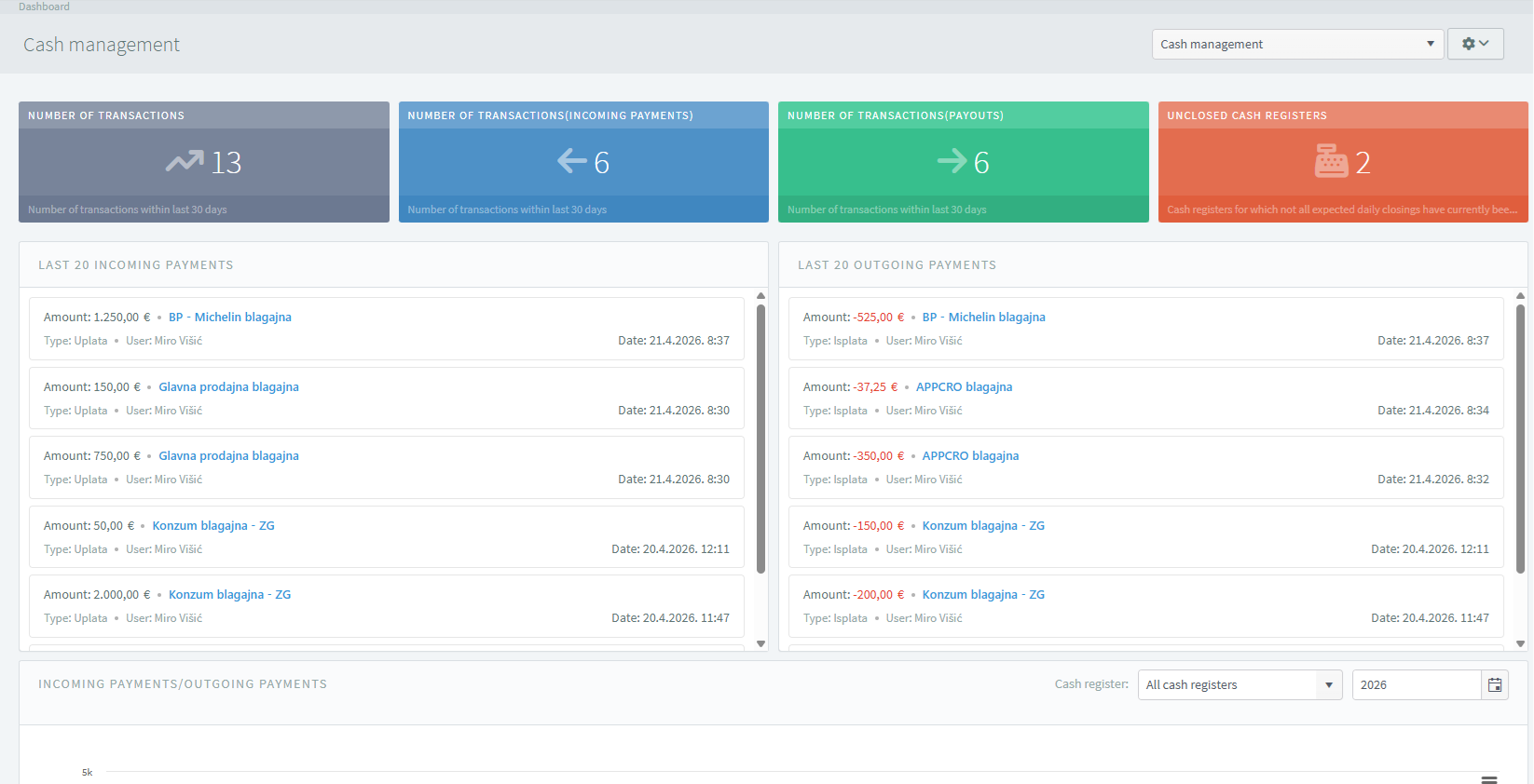 A system for managing cash registers and tracking cash handling within them. It includes the following modules: Dashboard; Cash register management; Records of cash deposits and withdrawals; Cash receipts and payments; Daily cash register statements and closings; Cash register balance and balance control; Transaction overviews; Documents; Reports.